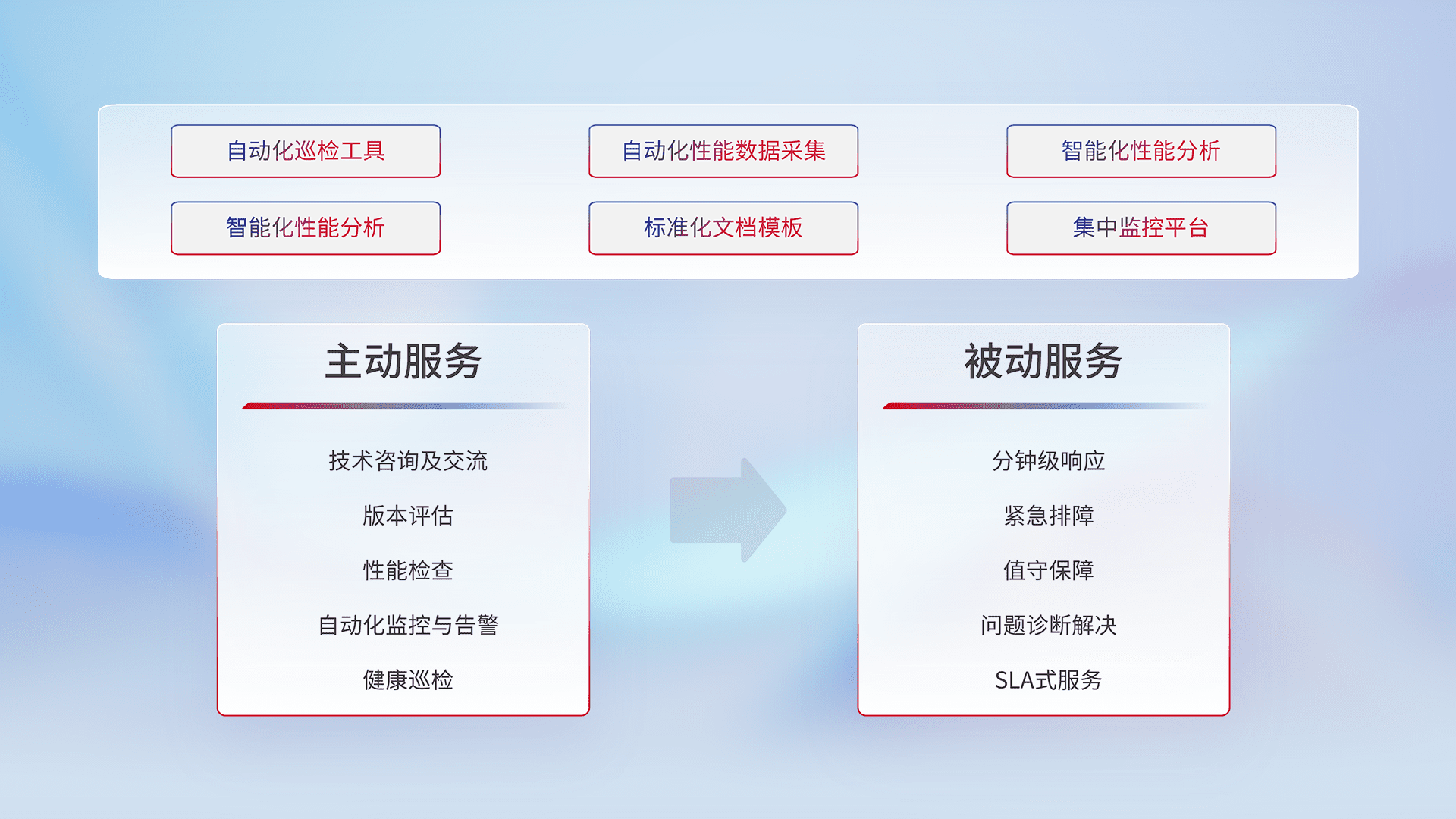 智能化工具和标准化文档,,,,保障服务质量,,,提供主动服务(包含技术咨询、、、版本评估、、、性能检查、、、、自动化监控与告警、、健康巡检)和被动服务包含(分钟级响应、、、紧急排障、、值守保障、、、、问题诊断解决、、、SLA服务)。。